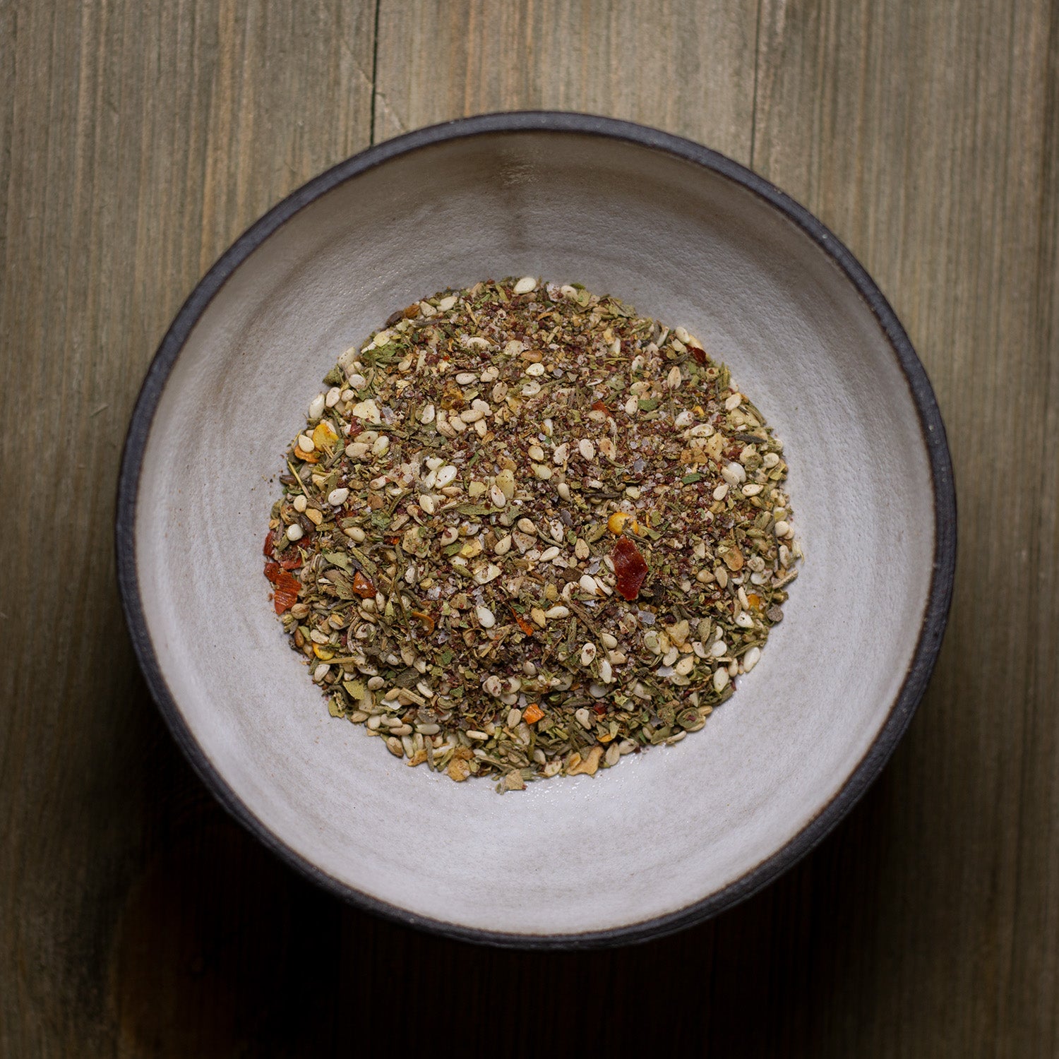 A savory blend of herbs, spices, sumac, and wood toasted sesame seeds with a hint of Diamond Crystal Kosher salt to tie it all together.